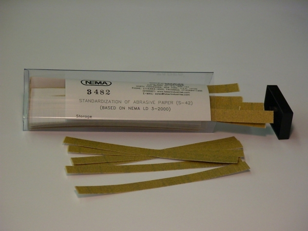 S-42 砂紙 - S-42 砂紙由非常精細的氧化鋁砂粒組成,分級為180 ANSI-CAMI,平均粒徑約為78μm(0.00304英寸)。 為了保持磨損率,必須在規定數量的測試循環(通常為200或500)之后更換砂紙條。常用于高壓裝飾層壓板,木地板,塑料,家具表面,油漆和清漆的磨耗測試。