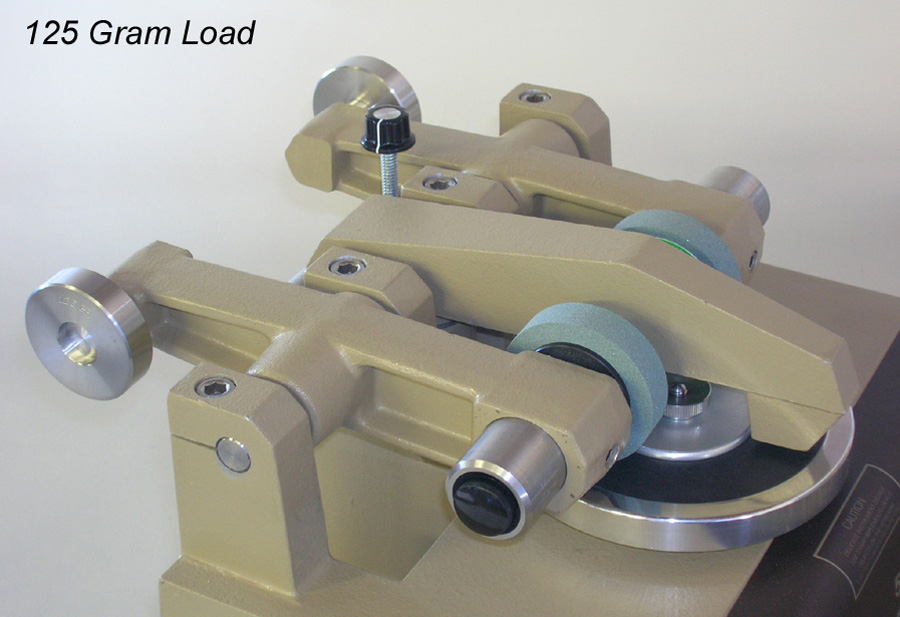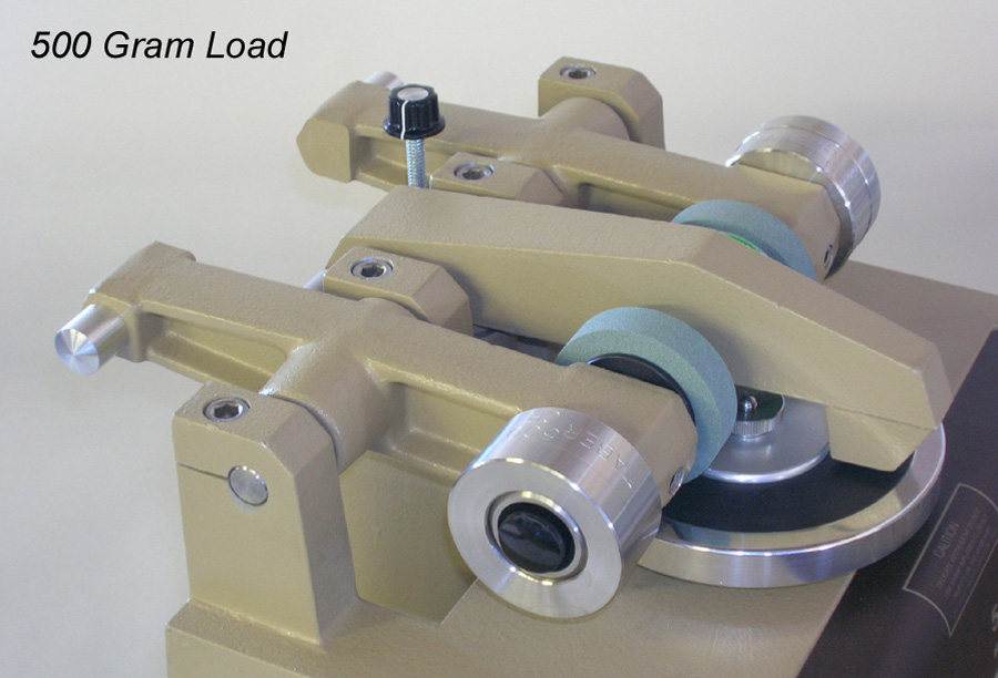 在沒有輔助砝碼的情況下,每個研磨臂向樣本施加250克的負載。當需要向研磨臂增加重量時,精密不銹鋼砝碼提供500克或1000克的標準磨輪負載。另外還有一組砝碼組合可向每個磨輪施加750克的負載。為了簡單起見,每個砝碼上都標有可向磨輪施加總負荷(研磨臂和砝碼總負荷)。標記為500克的砝碼,其實際重量是250克。同理,標記為1000克的砝碼,其實際重量為750克。